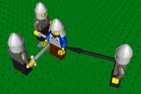 To perform an Attack action with this kind of weapon, the targeted unit must be in front of the attacker (180 degrees). Moreover, the targeted unit must be reachable by the weapon of the attacker, which means the weapon (in the hand of the attacker) must be able to touch the targeted unit.See the image beside for some examples of different attack distances according to the weapon used (the blue minifig is the target, and three attackers with three different weapons can reach him). |