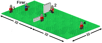 - The firer cannot fire at minifig 2, because this minifig is behind a wall and is not visible from the point of view of the firer.