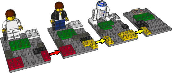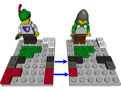 At the beginning of the second Round, all the minifigs on the battle field have a MB. It will be a waste of time to remove all these MB before starting the new Round, so instead, during the second round you will now remove the MB to mark a minifig as played. Then at the end of the second Round all the MB will be removed and you will be able to start the third Round as the first one. In fact during an odd Round you add the MB to mark a played minifig, and during an even Round you remove the MB to mark a played minifig. To remember in which kind of Round you are (an adding MB one or a removing MB one), you can build a little "Round Marker" with bricks. Put it studs up to indicate that you are in an adding MB Round, and studs down if you are in a removing MB Round. Flip your "Round Marker" at the end of each Round.
