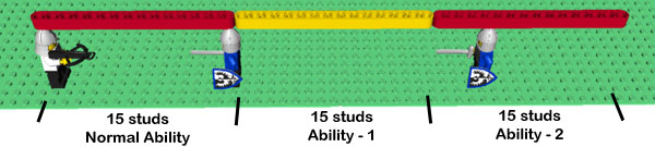 This is the same thing for the Dodge/Armor Ability. The Dodge Skill is marked with DARK GREY bricks and the Armor and shield and other physical protections are marked with BLACK bricks. As for the Attack/Damage Ability, if a unit changes his armor (by leaving his shield for example) during the game, then modify the black bricks according to the new armor value.