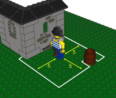 ![]() The pirate who has a Move Ability of 5 studs can move inside the white square. On his right, the house limits his move to 2 studs. |