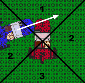 - The firer cannot fire at minifig 1, because this minifig is behind the firer.
