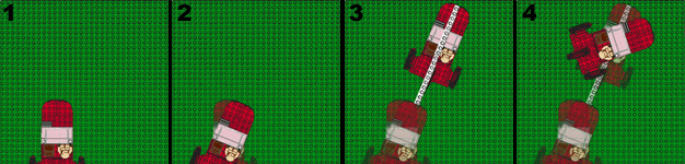 In the example above the pilot decided to do two Changing direction actions during his Turn, one before the compulsory move and the other after the move. The picture 1 shows the vehicle at the beginning of the Turn of the pilot. In picture 2, the pilot does a Changing direction action, and rotate the vehicle on itself from around 20 degrees. In picture 3 the vehicle is moved in straight line according to its current speed which is 4 in that case (so the vehicle moves to a distance of 20 studs). Finally in picture 4 the pilot does another Changing direction action, this time the player rotate the vehicle on itself from almost 45 degrees.