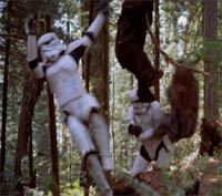 Once on a tree, a minifig must spend one action of its Action Budget to jump from the tree. The minifig can jump to a distance equal to its Move ability (it costs one action). It can also use more Move Actions (but of course no more than its Action Budget) to jump farer. In that case we consider that the minifig used a creeper to reach a far point. For example if an Ewok used his 2 actions, he can jump to a distance of 8 studs from the tree (because its Move Ability is 4). Another example: an Ewok encouraged 2 times by C3PO can use its 4 actions to jump to a distance of 4 x 4 = 16 studs.