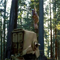 A minifig who jump from a tree can land on the top of an AT-ST if the distance is not too short. A minifig that jump from a tree and land on another minifig can inflict damage. The jumping minifig does a BR with as many brick as its Move Ability no matter the distance (so 4 for an Ewok and 6 for Chewbacca and Han Solo), and of course the target minifig does a resisting BR with its Dodge/Armor Ability.
